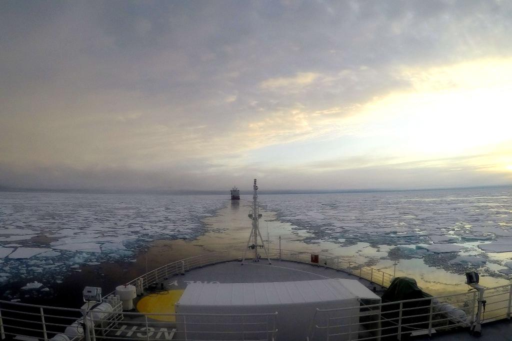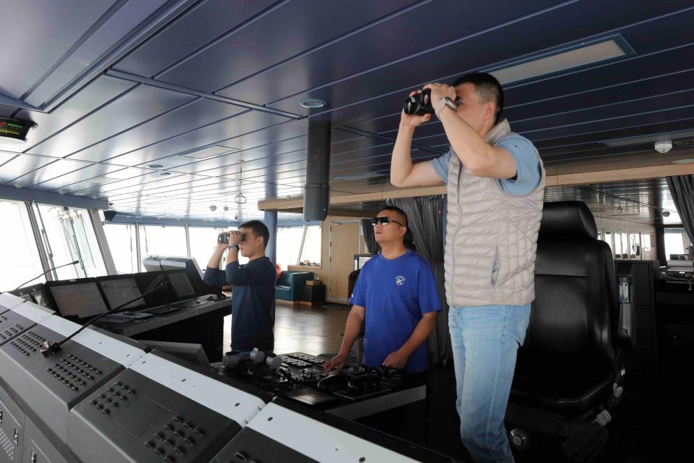 车主不仅要时刻关注前方冰情,雪龙2号建立了在冰区航行经验丰富的船长和大副轮班的驾驶台指导,两船配合默契,到第二阶段的中速跟航引导,有效应对,