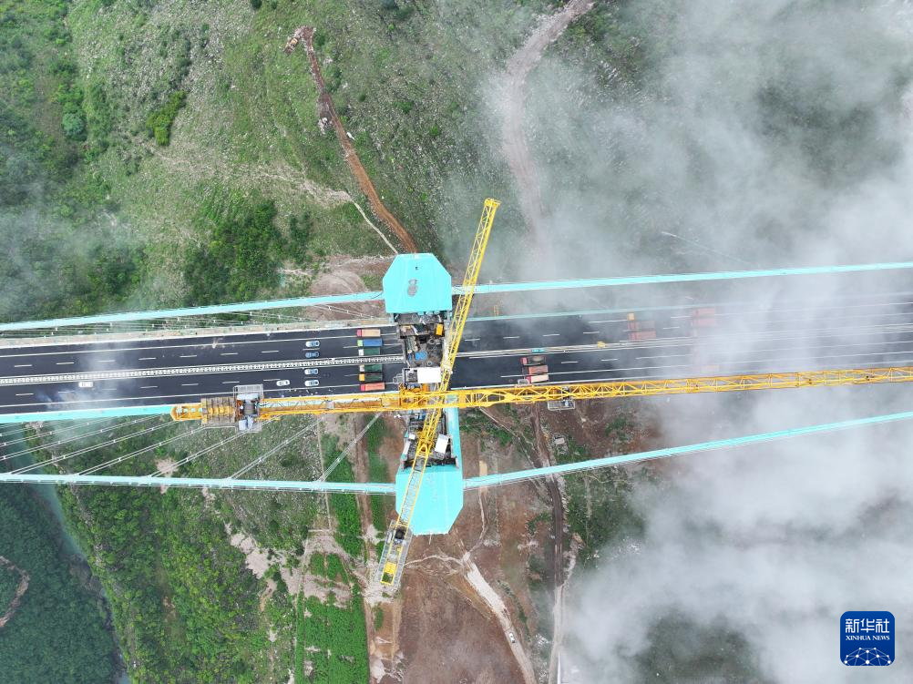 【8月21日拍摄贵州花江峡谷大桥荷载试验现场(无人机照片)。2022年开工建设的花江大桥,是贵州省六枝至安龙高速公路的控制性工程。在建世界第一高桥贵州花江大桥正式启动荷载试验。桥面至水面高度625米。